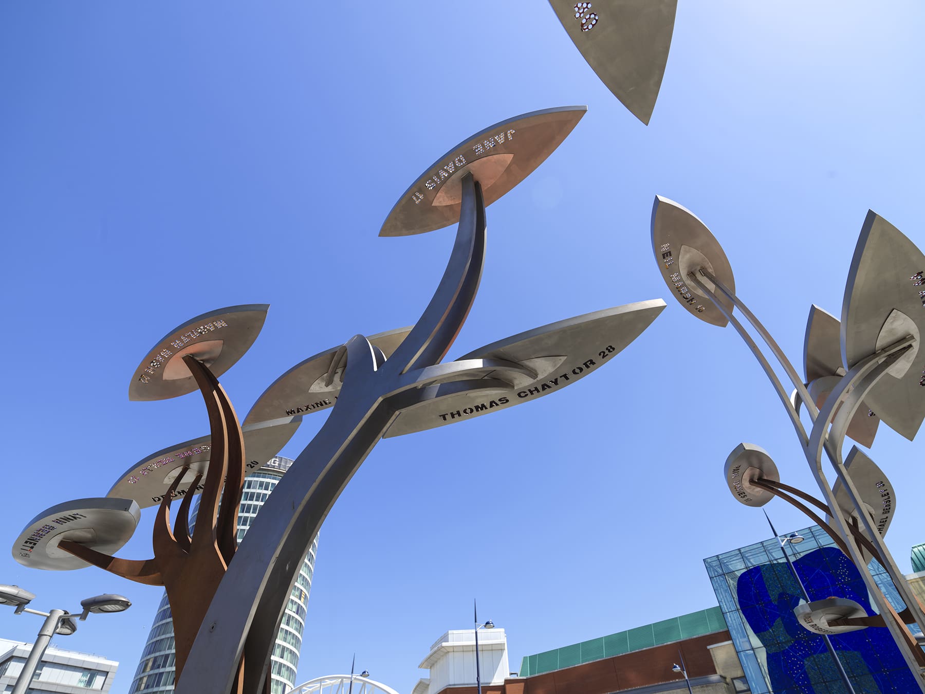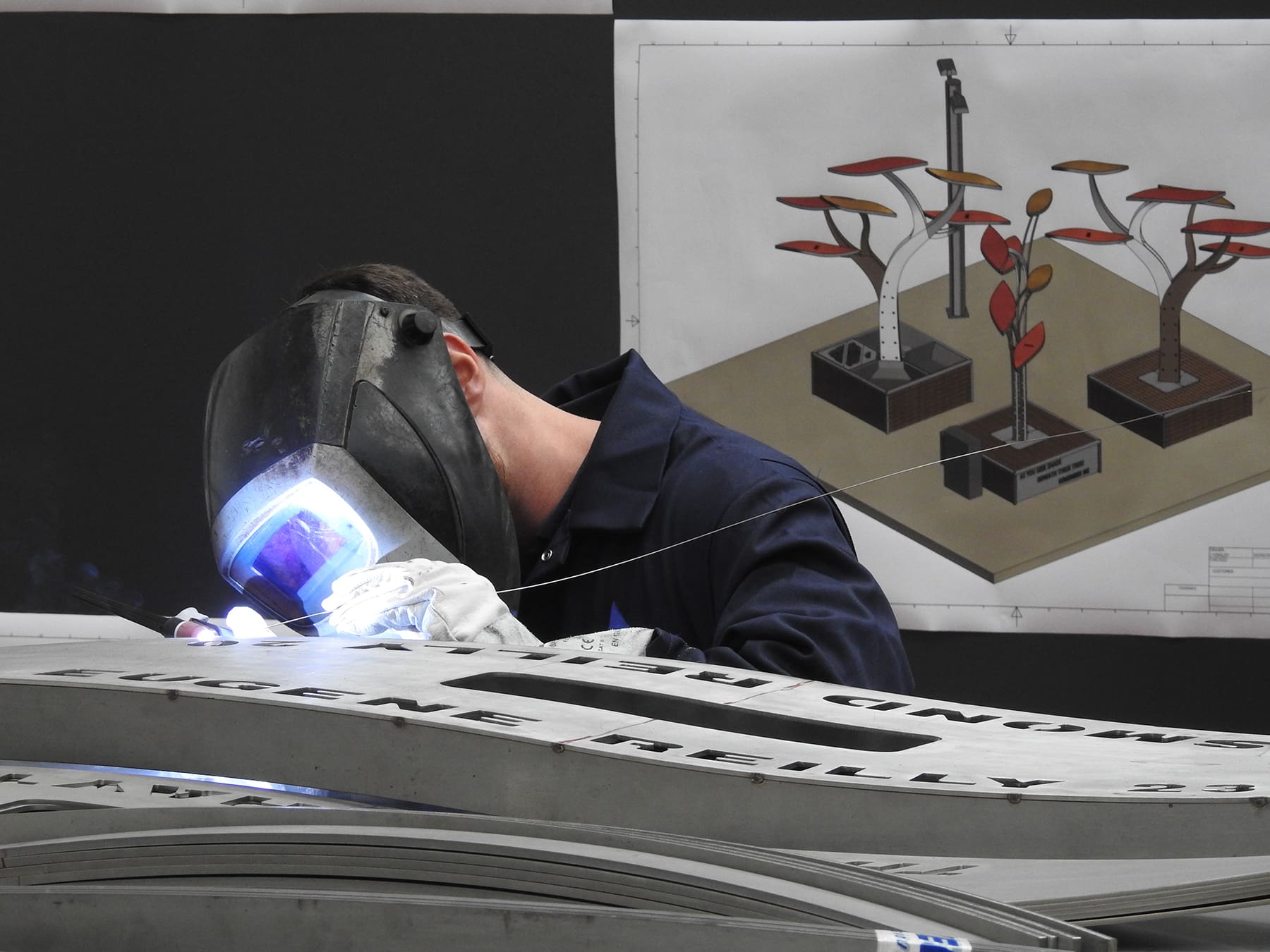 The memorial consists of three 15ft trees fabricated from a blend of corten steel and stainless-steel resting in iroko wood planters. Each tree contains seven leaves which have been designed to bear the names of the 21 victims along with their ages. These details were laser cut on the underside of the steel leaves to act as a lasting memory to their friends and family.